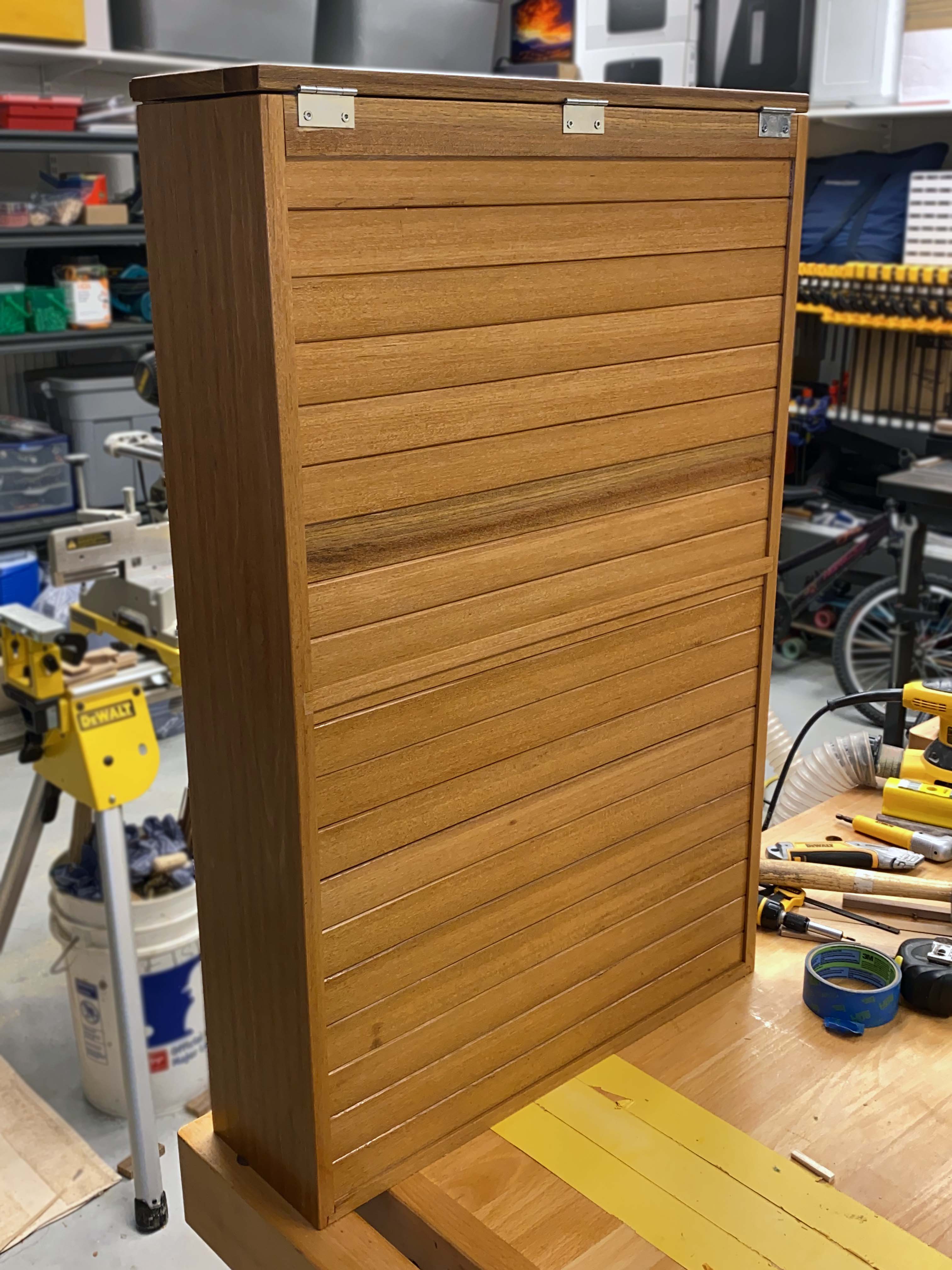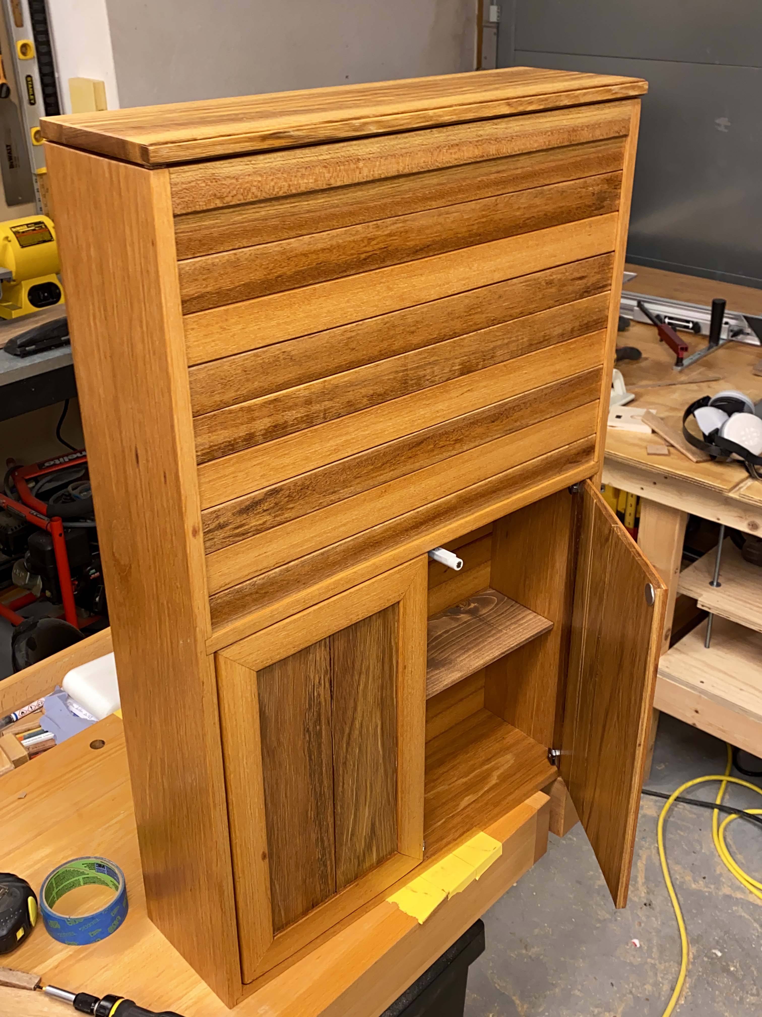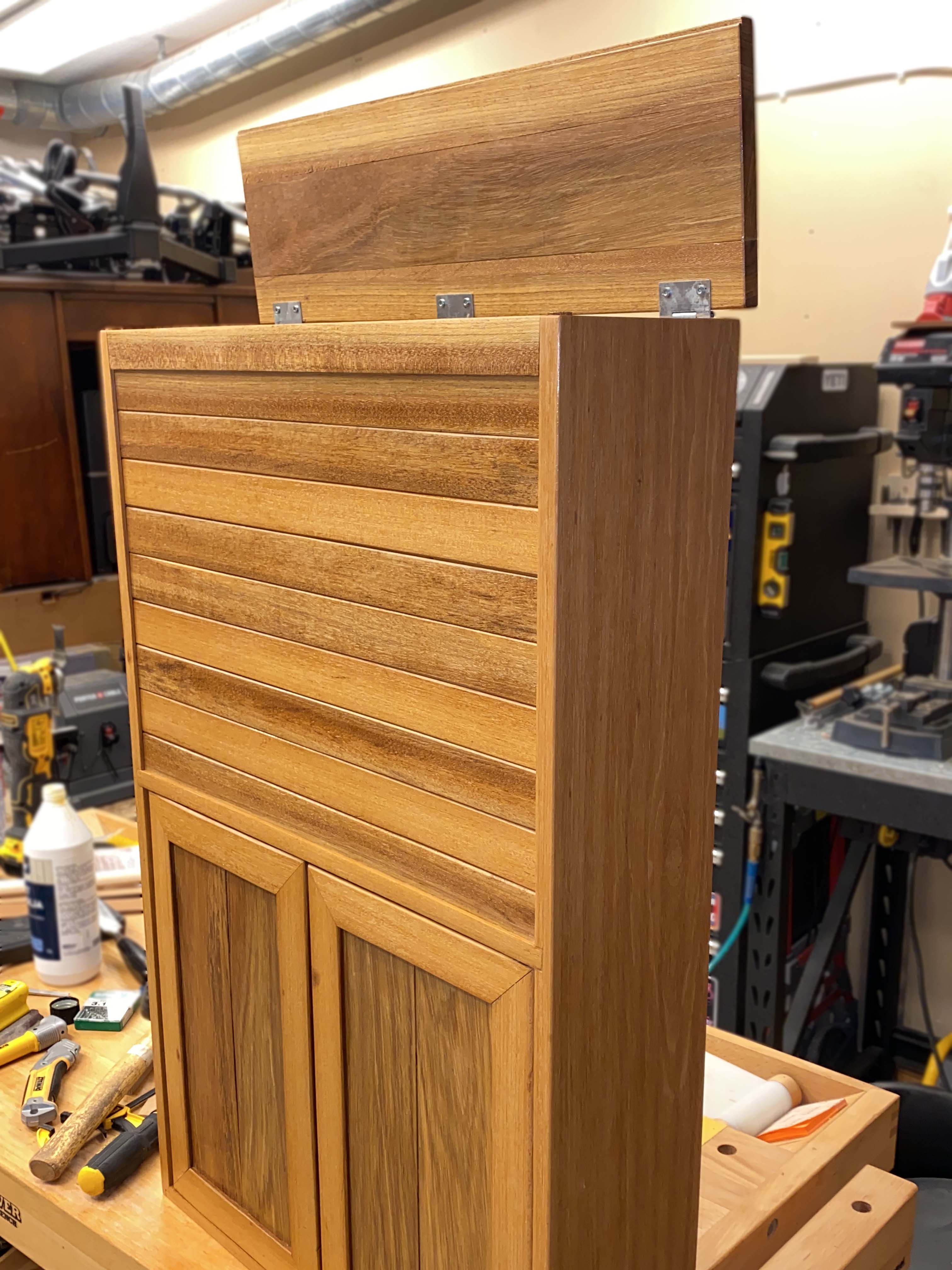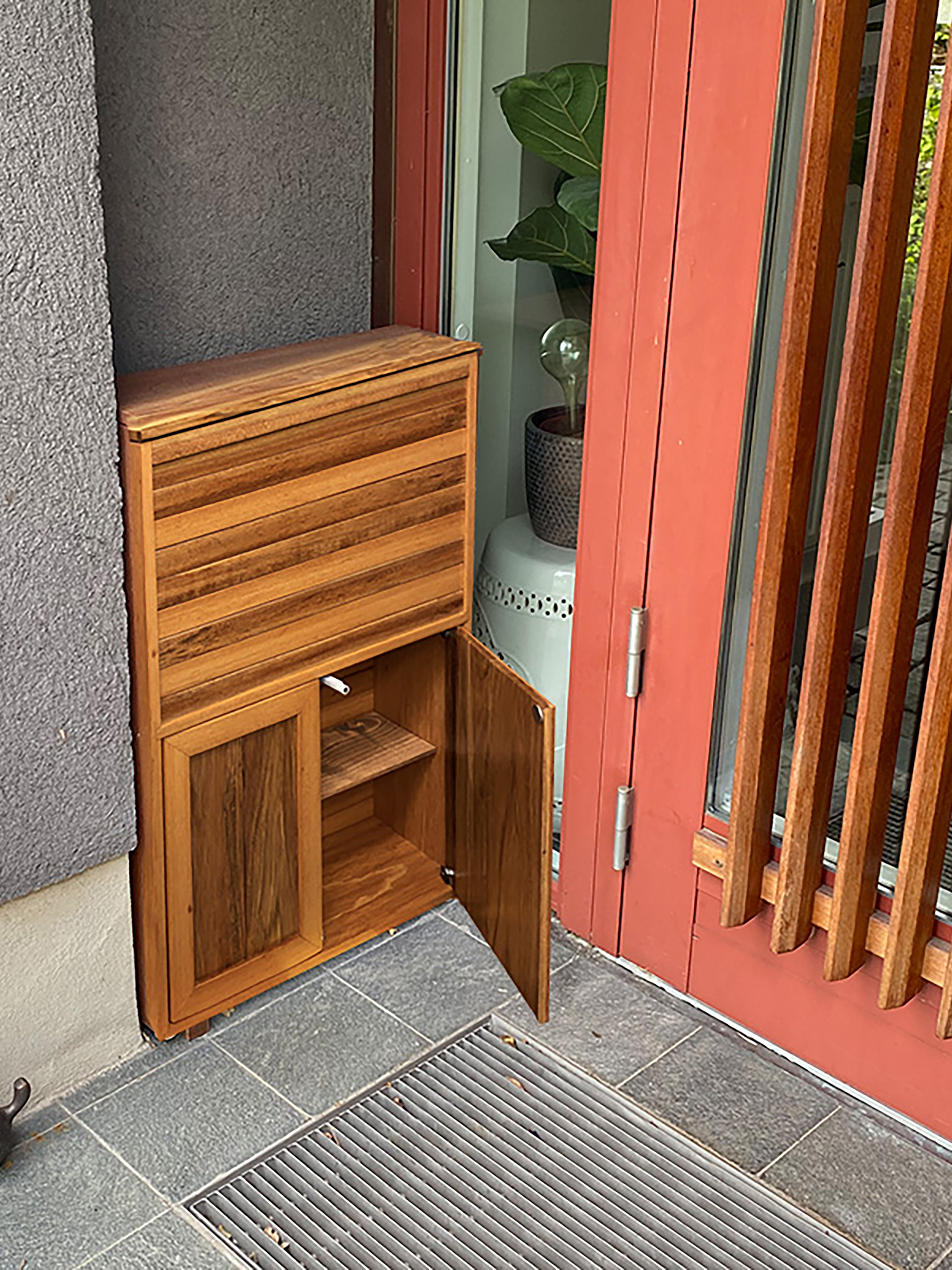 This custom cabinet was designed and built to fit a small area by a front door. It was purpose-built for the family dog's supplies and toys. The top part is an open cabinet with a lid, while the bottom has two shelves. This cabinet was crafted in ipe and features tongue and groove construction with mitered cabinet doors. Finished with boiled linseed oil. The door cabinet measures approximately 520mm x 155mm x 800mm (L x W x H).