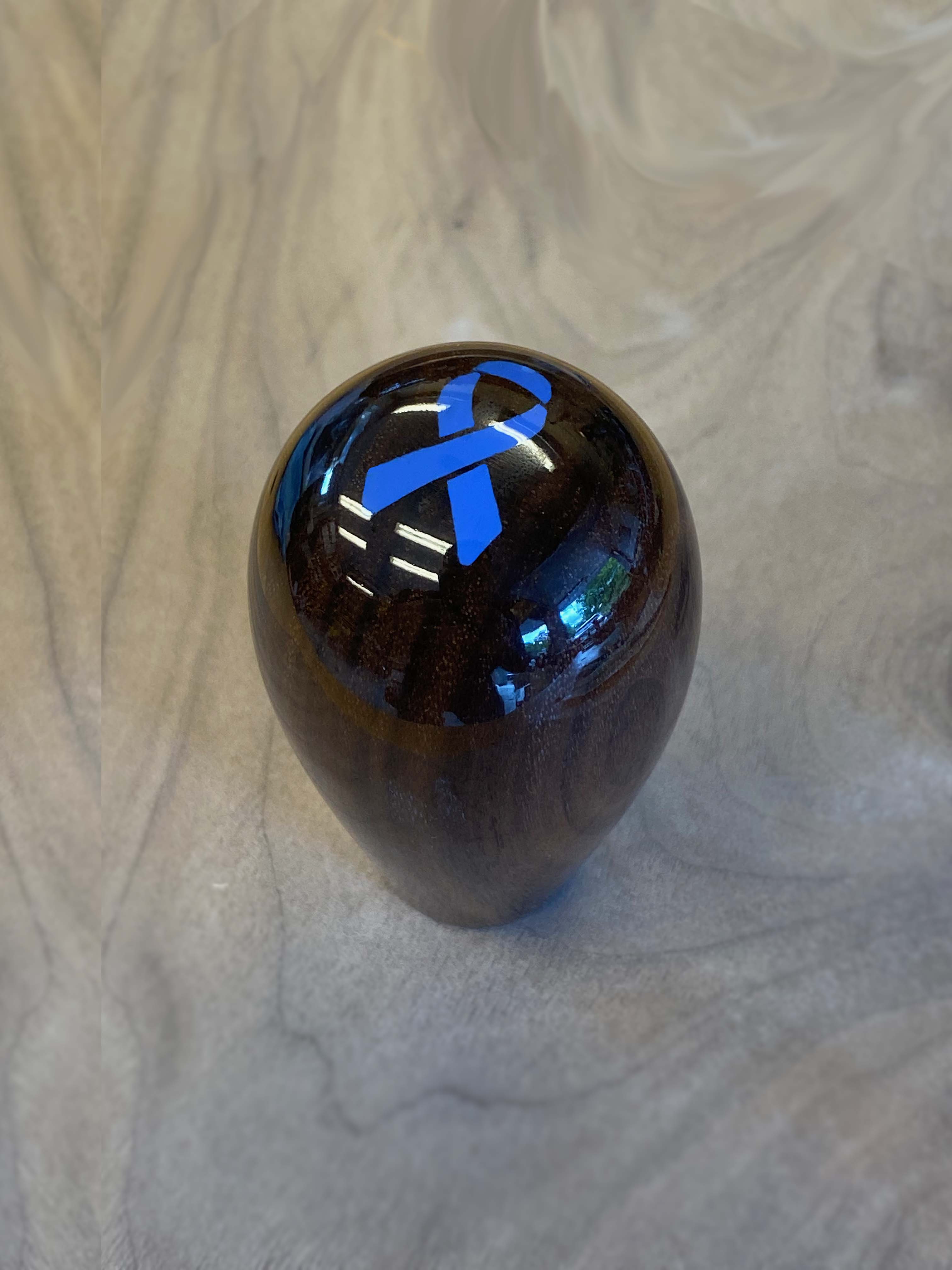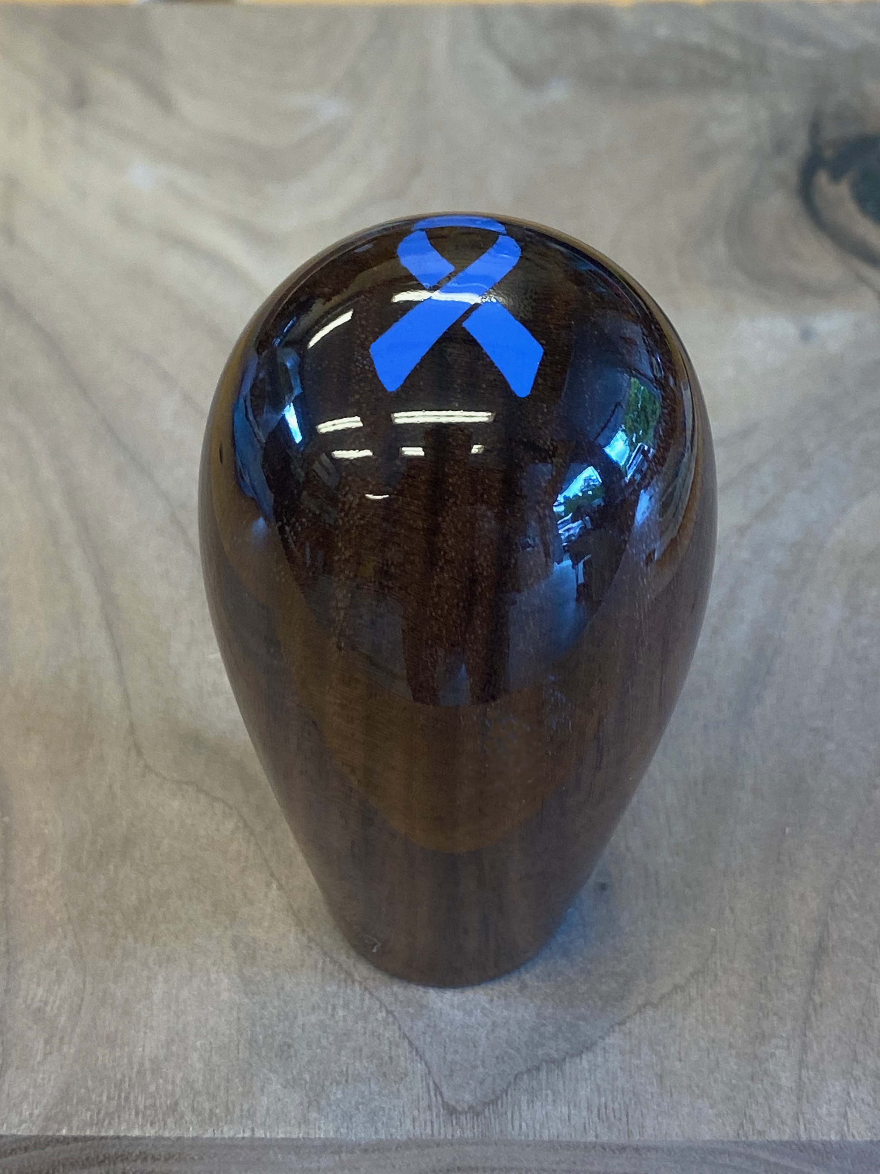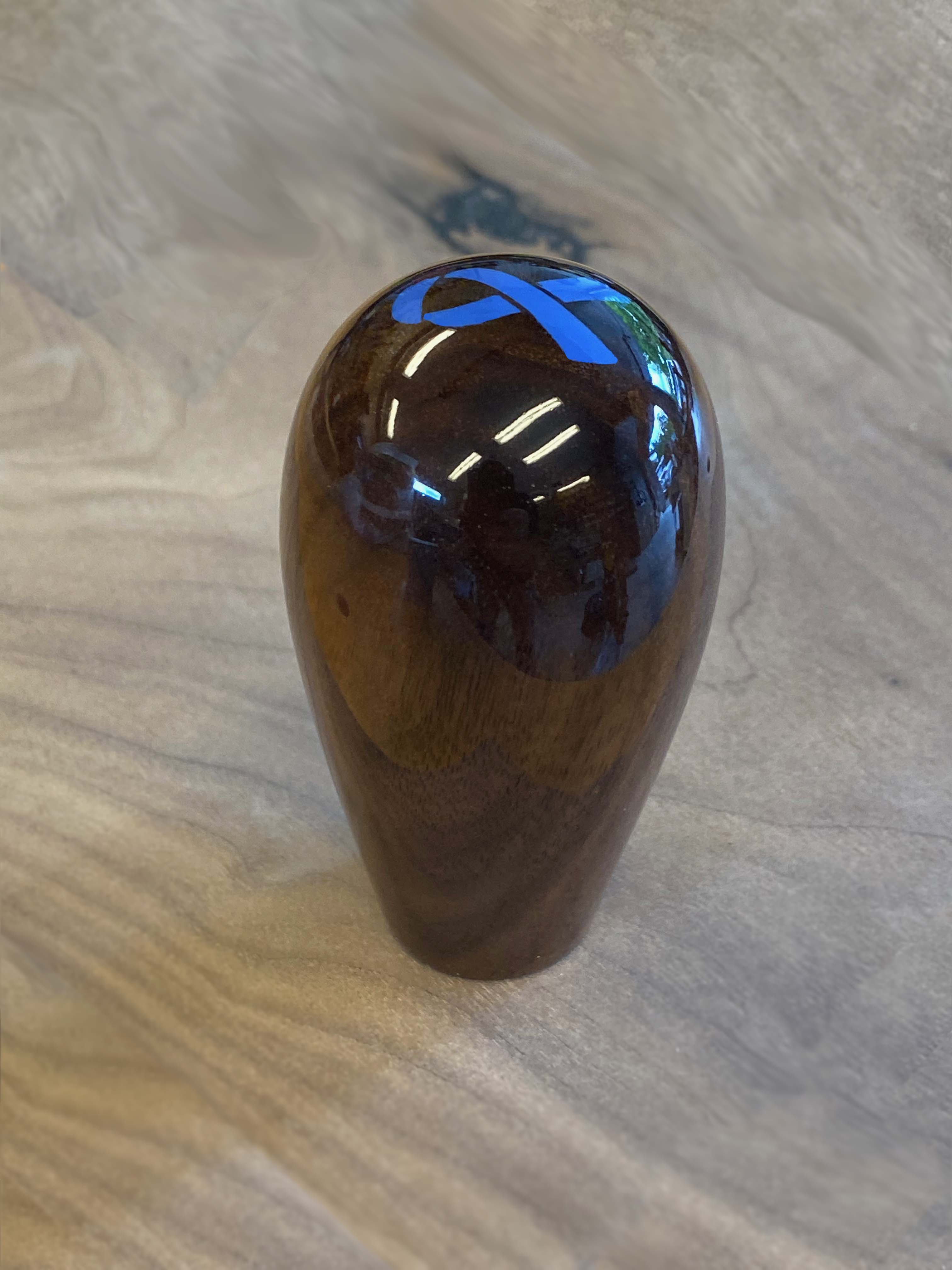 This gear shift knob was designed and crafted in support of a loved one's fight with stomach cancer. The gear shift knob was turned from a solid piece of walnut. The epoxy inlay is a periwinkle blue ribbon which is the ribbon color designated for stomach cancer. The finish on this piece is two coats of high gloss epoxy. This gear shift knob measures approximately 50mm x 50mm x 100mm (L x W x H).