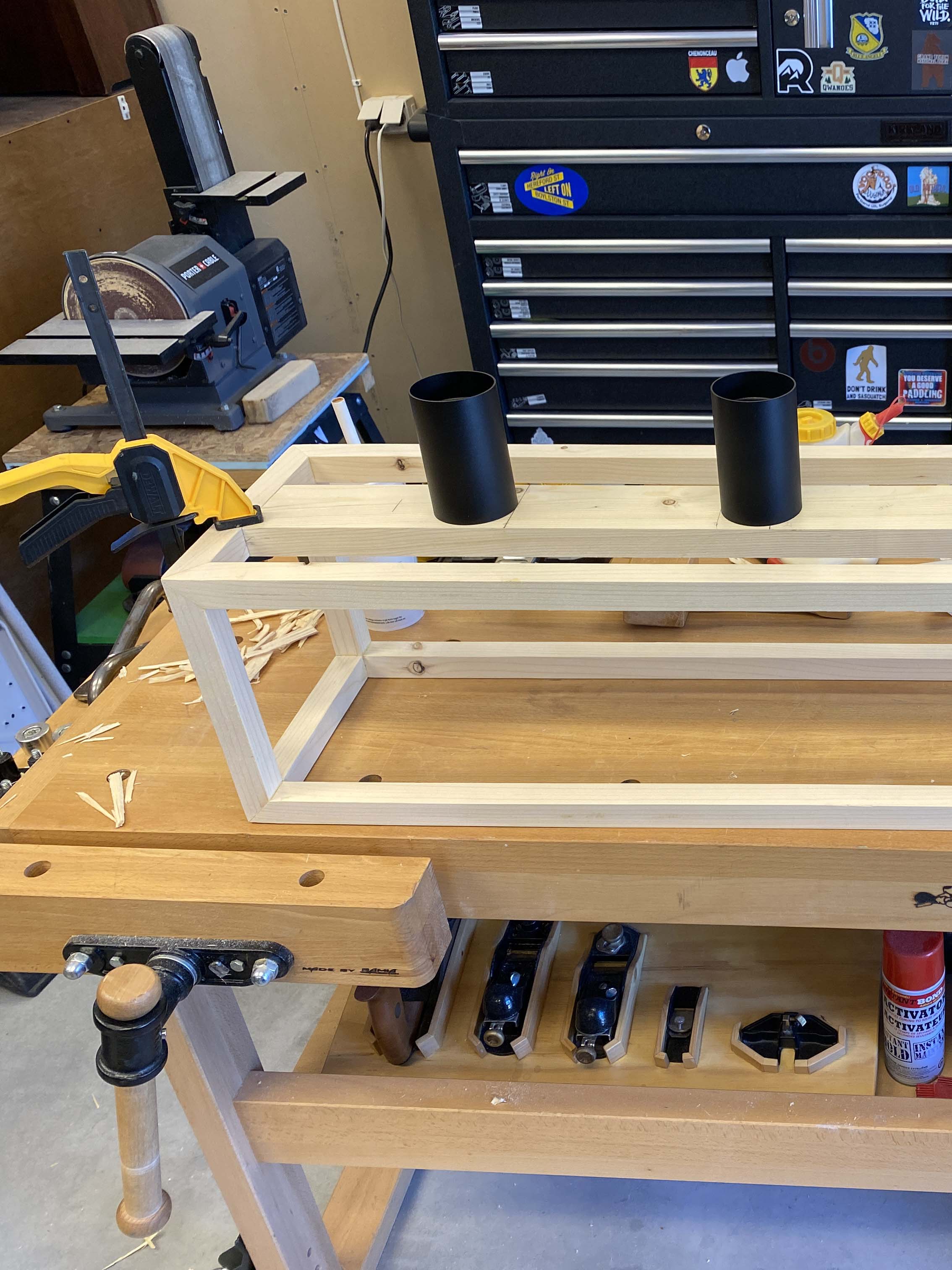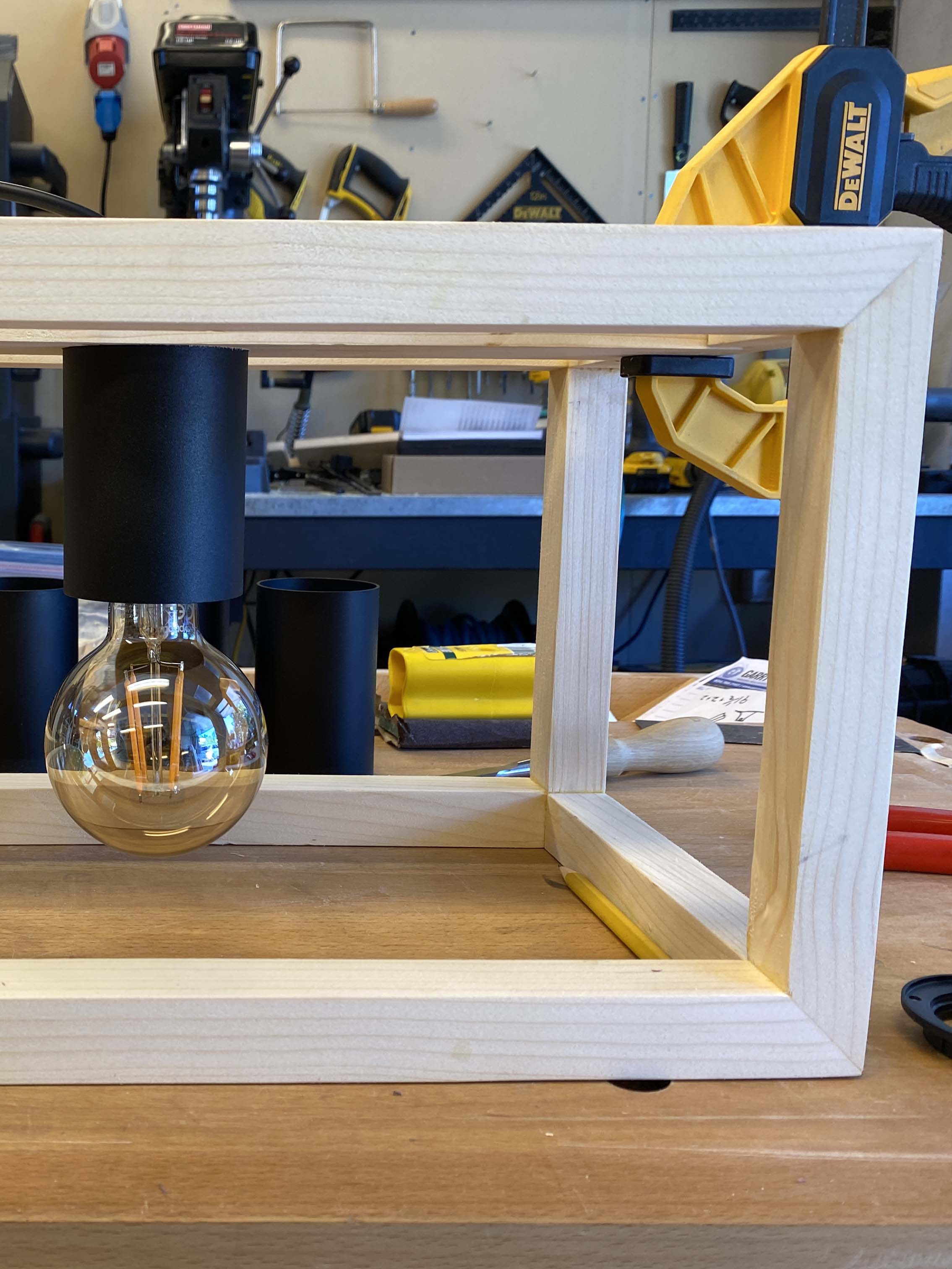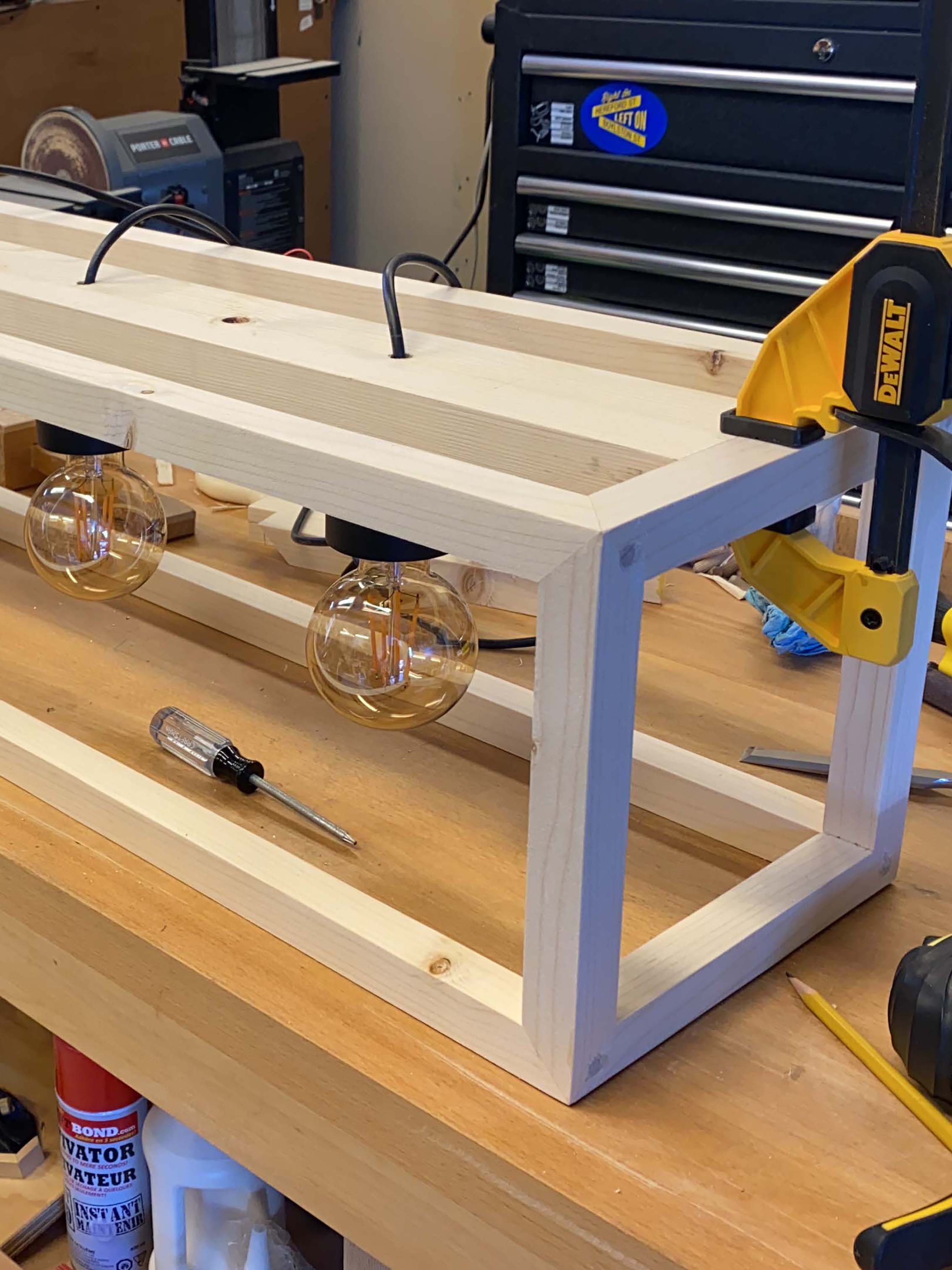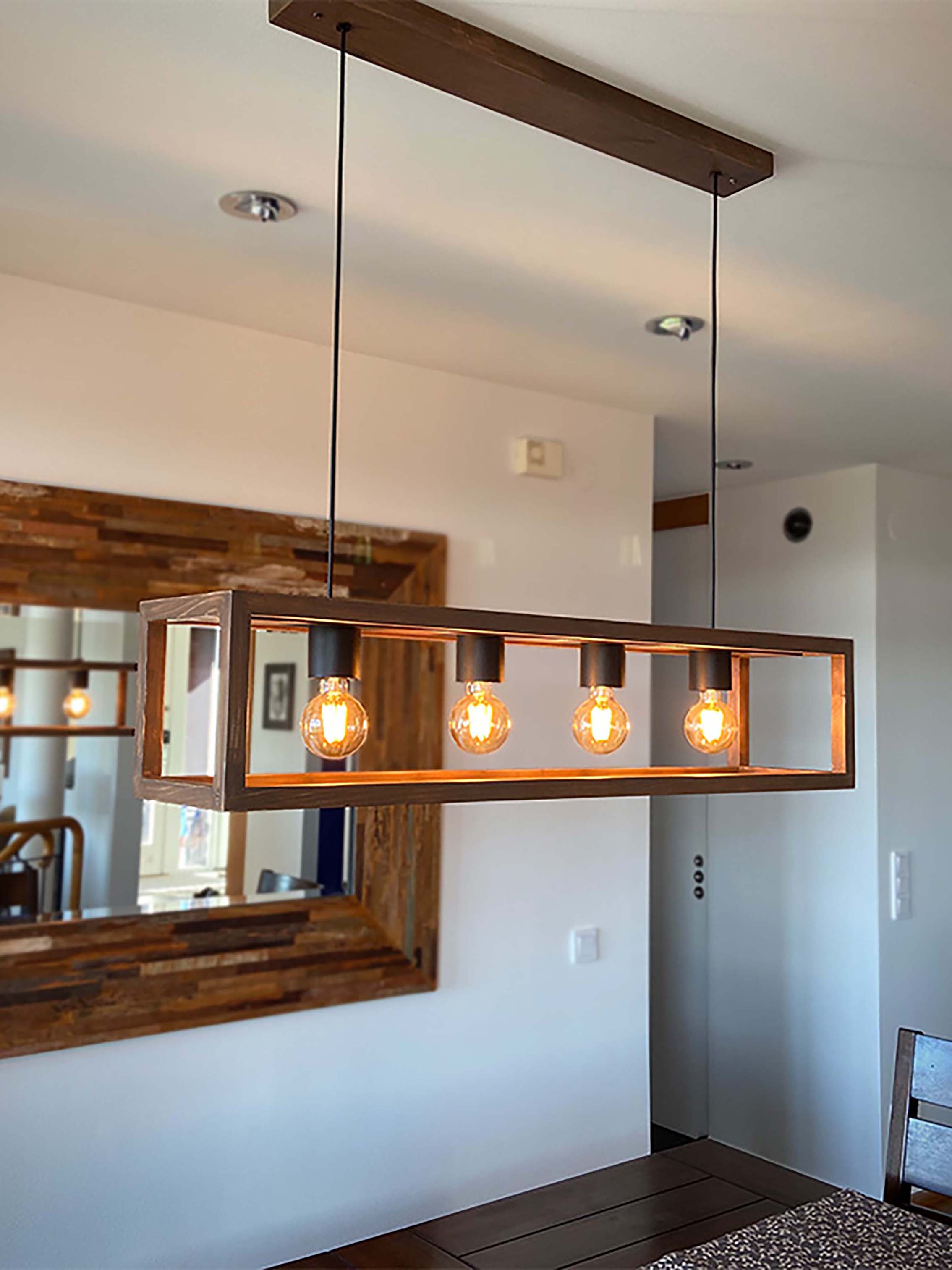 This modern dining room pendant light is crafted in pine and finished with an antique oak stain followed by two coats of matte lacquer. The pendant light features mitered joints reinforced with beech wood dowels. Keep in mind this pendant light can be customized. By altering the dimensions, changing the number of bulbs, or selecting a different species of wood, this pendant light can become truely personalized. The pendant light measures approximately 1070mm x 230mm x 230mm (L x W x H).