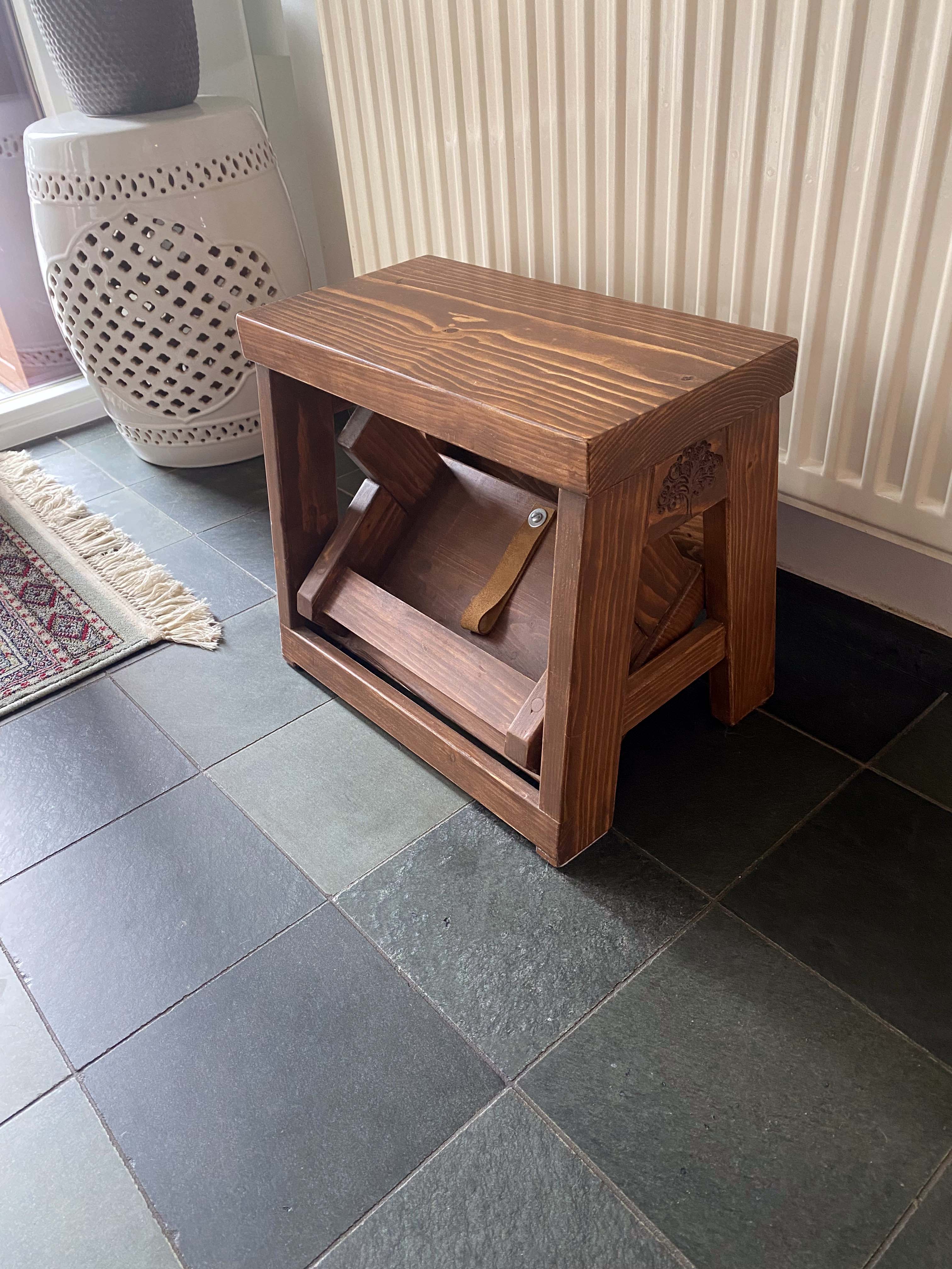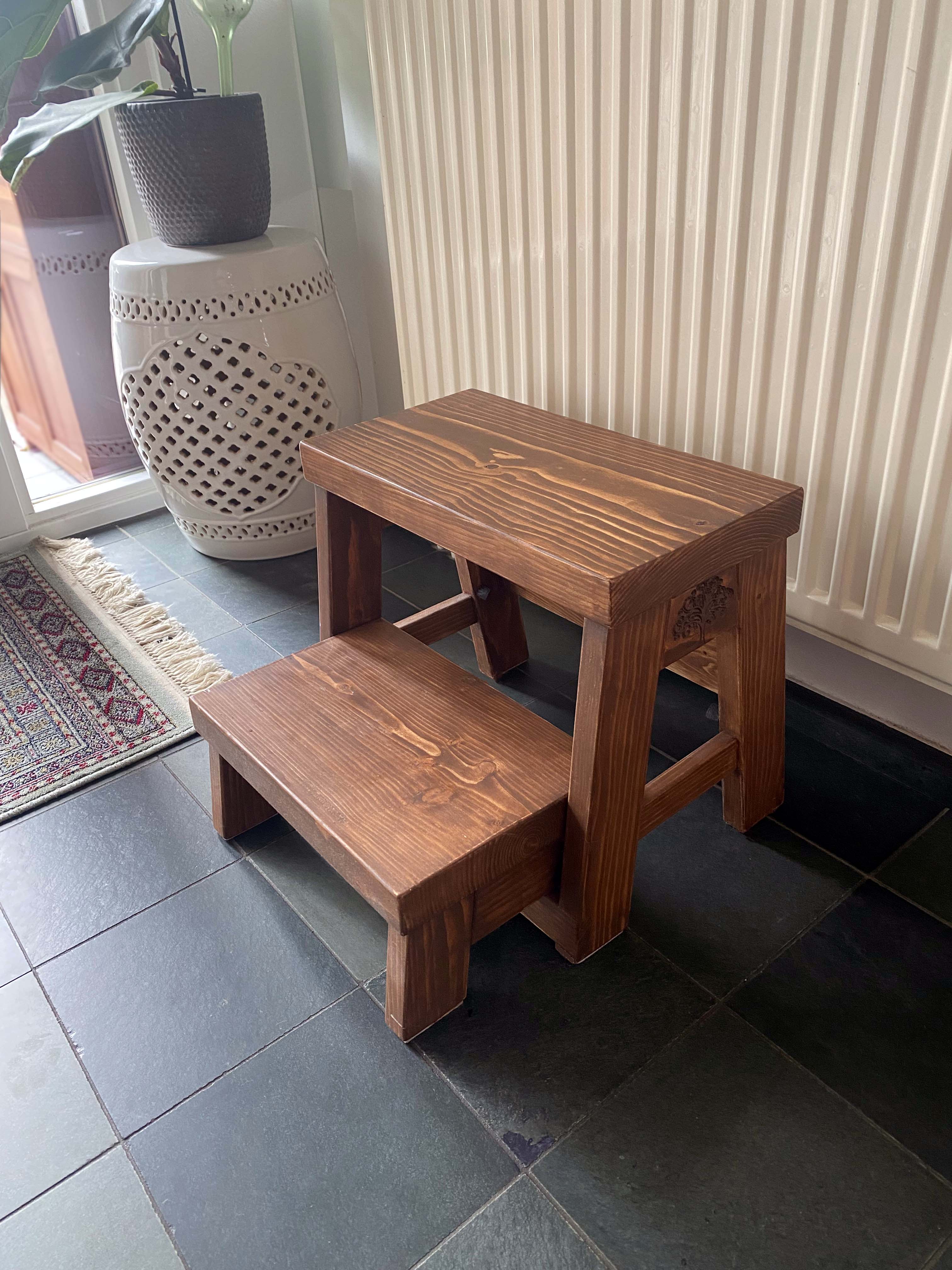 This step stool was designed primarily for use in a kitchen. The stool features a folding first step to keep the footprint as small as possible and making it easy to use by children. A leather strap makes it easy to unfold the first step. This stool is crafted in pine with mortise and tenon joinery. The stool is finished with a mocha stain and lacquer. The step stool measures approximately 405mm x 290mm x 350mm (L x D x H) when the first step is folded and 405mm x 440mm x 350mm (L x D x H) when the first step is out.